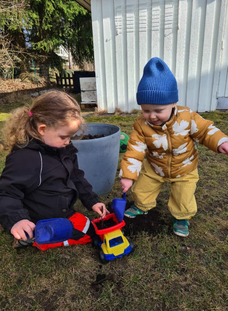 De stannade kvar till söndag lunch så vi hann umgås en hel del. Det blev mycket lek och bus förstås. Under lördagen var vi ute i trädgården och de hjälpte mormor att gräva ut jord från en stor kruka. Önskemålet från Izzy var att jag ska så blommor där sedan 😉. Men jag tror att de får svårt att klara sig mitt på gräsmattan där alla rör sig.
